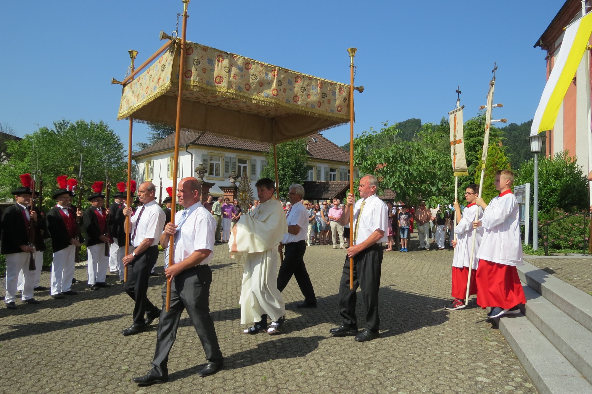 Auf dem Kirchplatz erfolgte der Ehrensalut der Bürgerwehr Unterharmersbach, der von vielen Gästen aufmerksam beobachtet wurde. Der Festtag Fronleichnam wurde eindrucksvoll gestaltet und wird den Teilnehmern als großes Kirchenfest in Erinnerung bleiben.