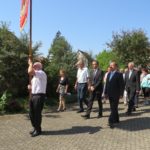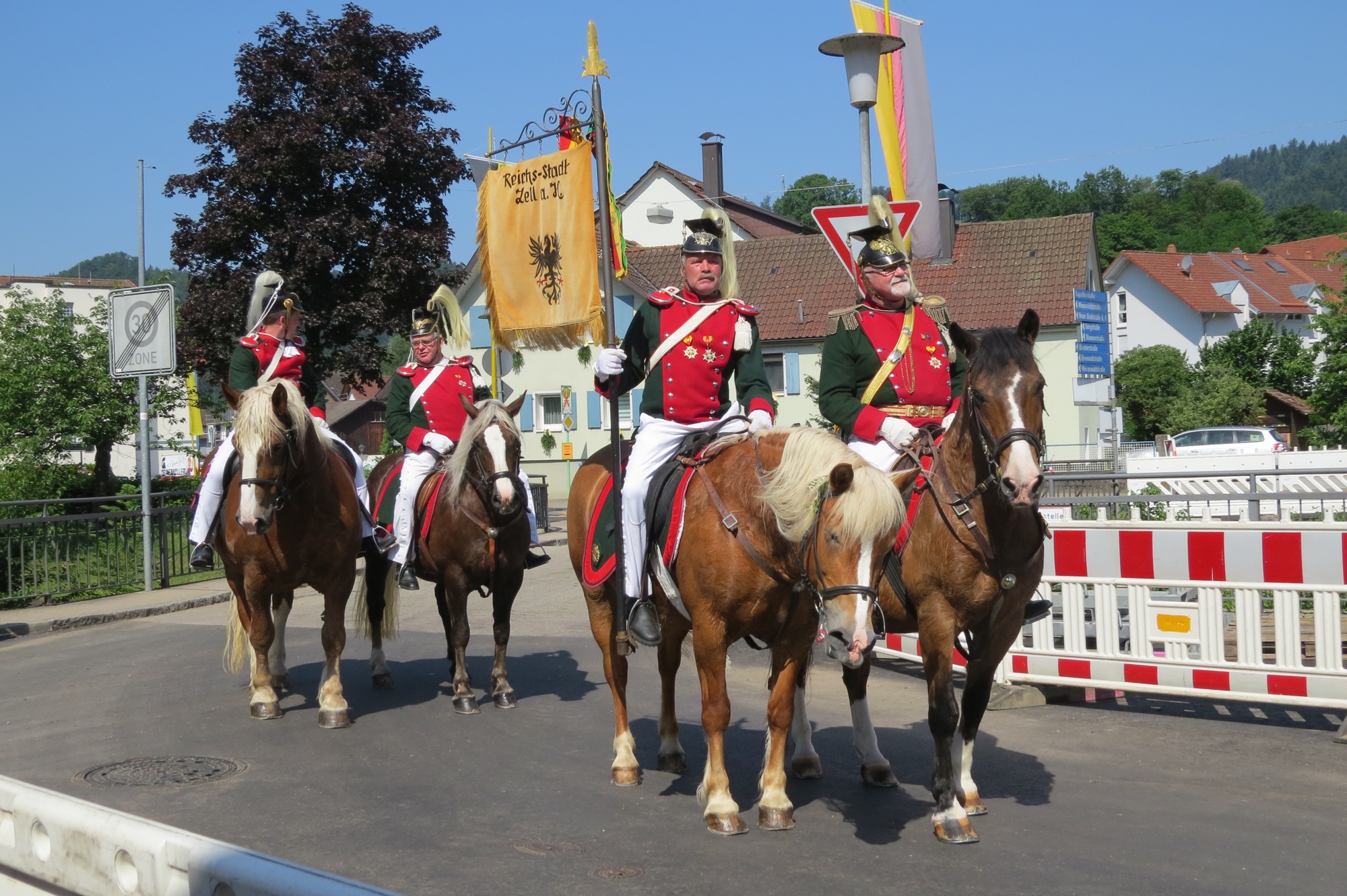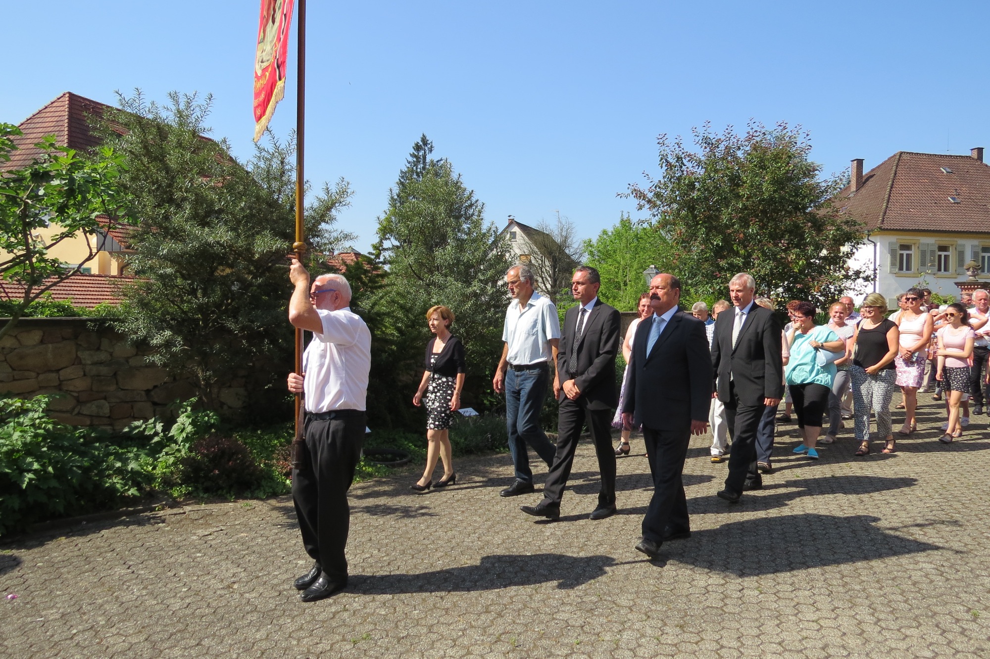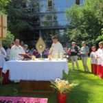 Nach der Eucharistiefeier in der Pfarrkirche wurde die Prozessionsordnung bekannt gegeben. In dieser Reihenfolge verließen die Gläubigen die Kirche und formierten sich zu der großen Prozession über die Hauptstraße zum Seniorenzentrum »St. Gallus«. Die Bauarbeiten bei der Lindenbrücke waren rechtzeitig zum Glaubensfest fertig und der alte Prozessionsweg konnte gegangen werden. Alle Gruppierungen fanden Platz im großen Park vor dem Seniorenzentrum. Die Schattenplätze waren begehrt – die Sonne hatte schon am Vormittag die Temperaturen sehr hoch steigen lassen. Vertreterinnen des Roten Kreuz verteilen Wasser an die Teilnehmer.