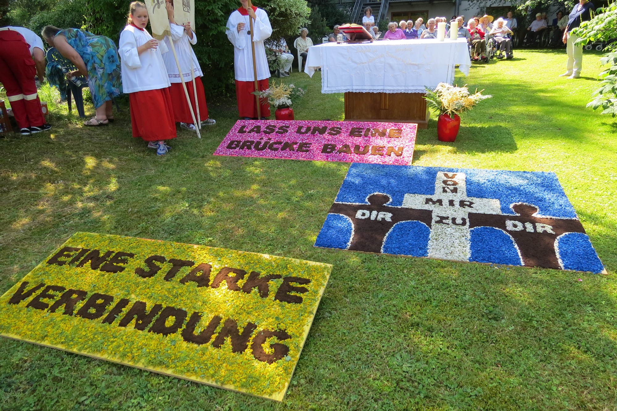 Pfarrer Gerner begrüßte die Senioren: »Es ist ein guter alter Brauch, am Herrgottstag zu ihnen in den Park zu ziehen. Der Glaube verbindet uns.« Drei Blumenteppiche stellten das Thema der Feier dar. Die bunten Farben der Blüten leuchteten im Sonnenlicht und die Blumenteppiche waren ein beliebtes Fotomotiv. An die Senioren gewandt sagte Pfarrer Gerner: »Gott ist die Verbindung, die Brücke zu uns Menschen, die uns auch im Alter und bei Krankheit trägt.«