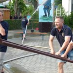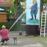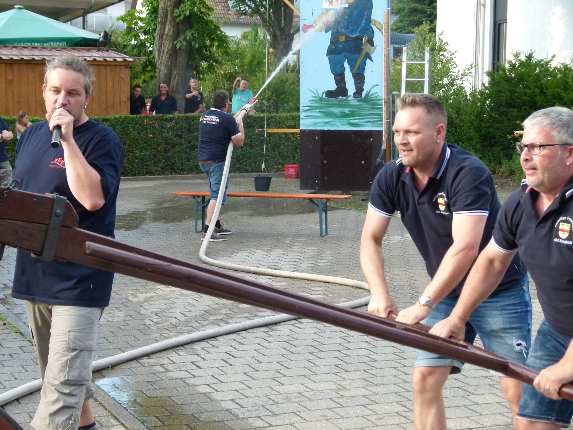 Pünktlich um 18 Uhr begrüßte Abteilungskommandant Felix Schwendemann am vergangenen Samstag die Besucher und Mannschaften zum Spritzer-Wettbewerb. Danach erfolgte die Auslosung der Startreihenfolge. Bei dem Wettbewerb ging es darum, innerhalb von drei Minuten die alte Handdruckspritze von 1833 mit Wasser zu befüllen und so viel Wasser wie möglich mit einem Strahlrohr in eine Öffnung zu spritzen. Schon das Befüllen der Spritze mit den Eimern aus Segeltuch war nicht ganz einfach und eine ziemlich nasse Angelegenheit. Das Pumpen an der alten Spritze war kräfte­zehrend und auch das Zielen mit dem Strahlrohr war gar nicht so einfach, wie es aussah. Da sich die Öffnung durch einen Mechanismus langsam verengte, war Eile geboten. Die Teilnehmer mussten die richtige Kombination finden, damit sich immer genügend Wasser in der Spritze befand und im richtigen Rhythmus gepumpt wurde. So konnte sich ein gleichmäßiger Wasserstrahl entwickeln. Wenn dann noch richtig gezielt wurde, stand einem Sieg nichts mehr im Wege.