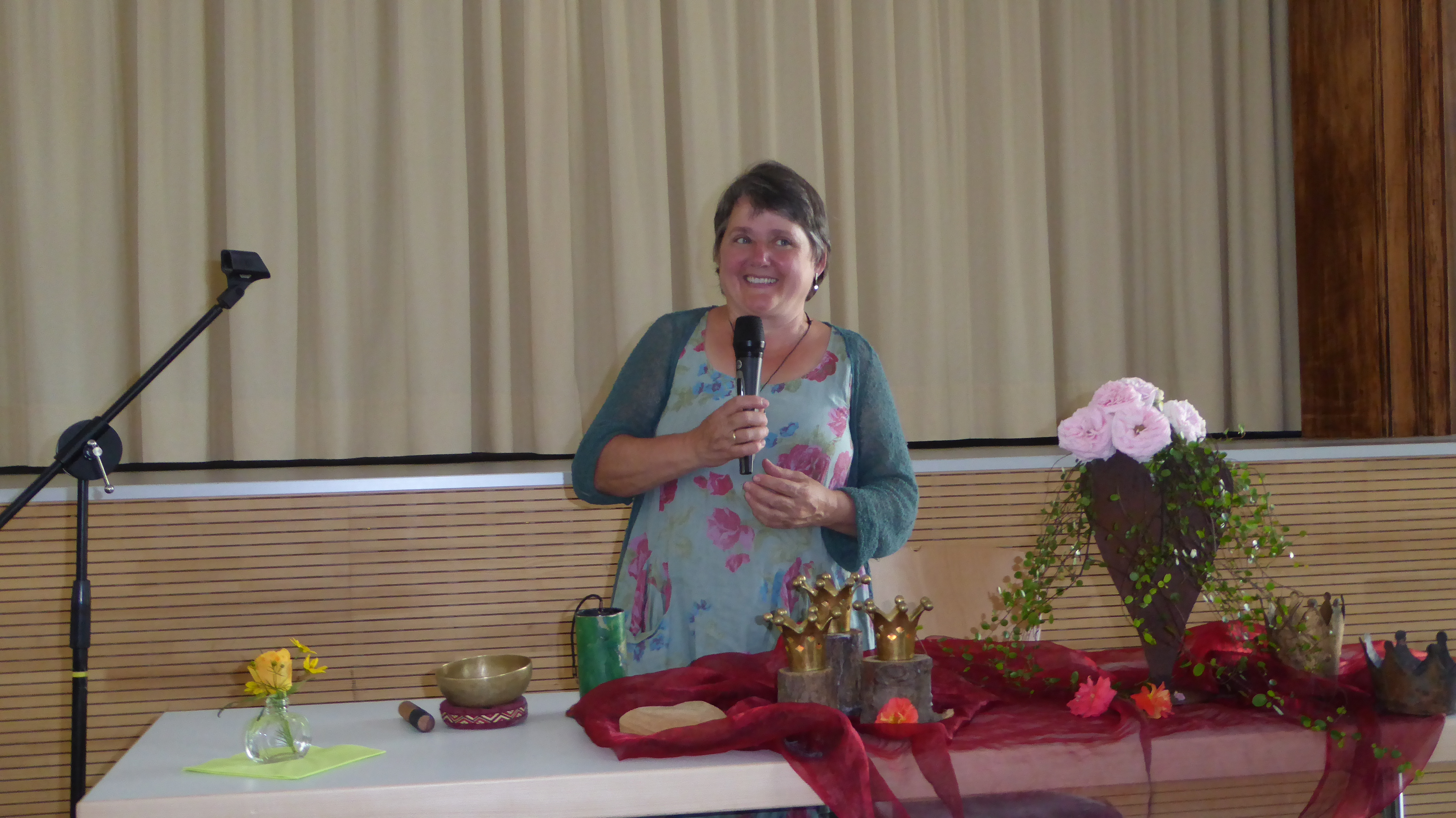 Nach Kaffee und Kuchen nahm Elisabeth Ehret aus Niederschopfheim an dem von ihr märchenhaft dekorierten Tisch ihren Platz ein und führte mit dem Schlag auf eine Klangschale und deren beruhigendem und langsam ausklingenden Ton die Senioren in das Reich der Träume und die Märchenwelt der Rosen.