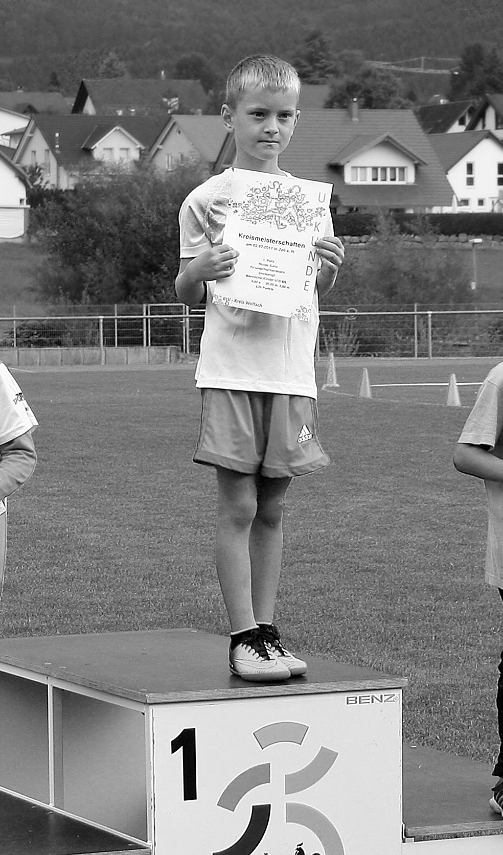 Die jüngsten Klassen absolvierten einen Dreikampf (50m, Weitsprung, Ballwerfen) und erreichten folgende Ergebnisse: Eine Überraschung gab es in der Klasse M8 durch Niclas Kunz, der in seinem ersten Wettkampf gleich als Kreismeister ganz oben auf dem Siegertreppchen stehen durfte. Er erreichte als Kreismeister 639 Punkte. Es folgten: 4. Samuel Klosek 529 P., 5. Joshua Groß 526 P., 13. Felix Kienzler 352 P., 17. Jannis Riehle 258 P., 18. Max Hainz 195 P., 19. Jonas Richter 176 P.; M9: 4. Silas Munz 568 P.; W8: 8. Maja Geiges 492 P., 10. Klaudija Polap 394 P.; W9: 6. Janine Klosek 626 P., 8. Malia Kresina 518 P.