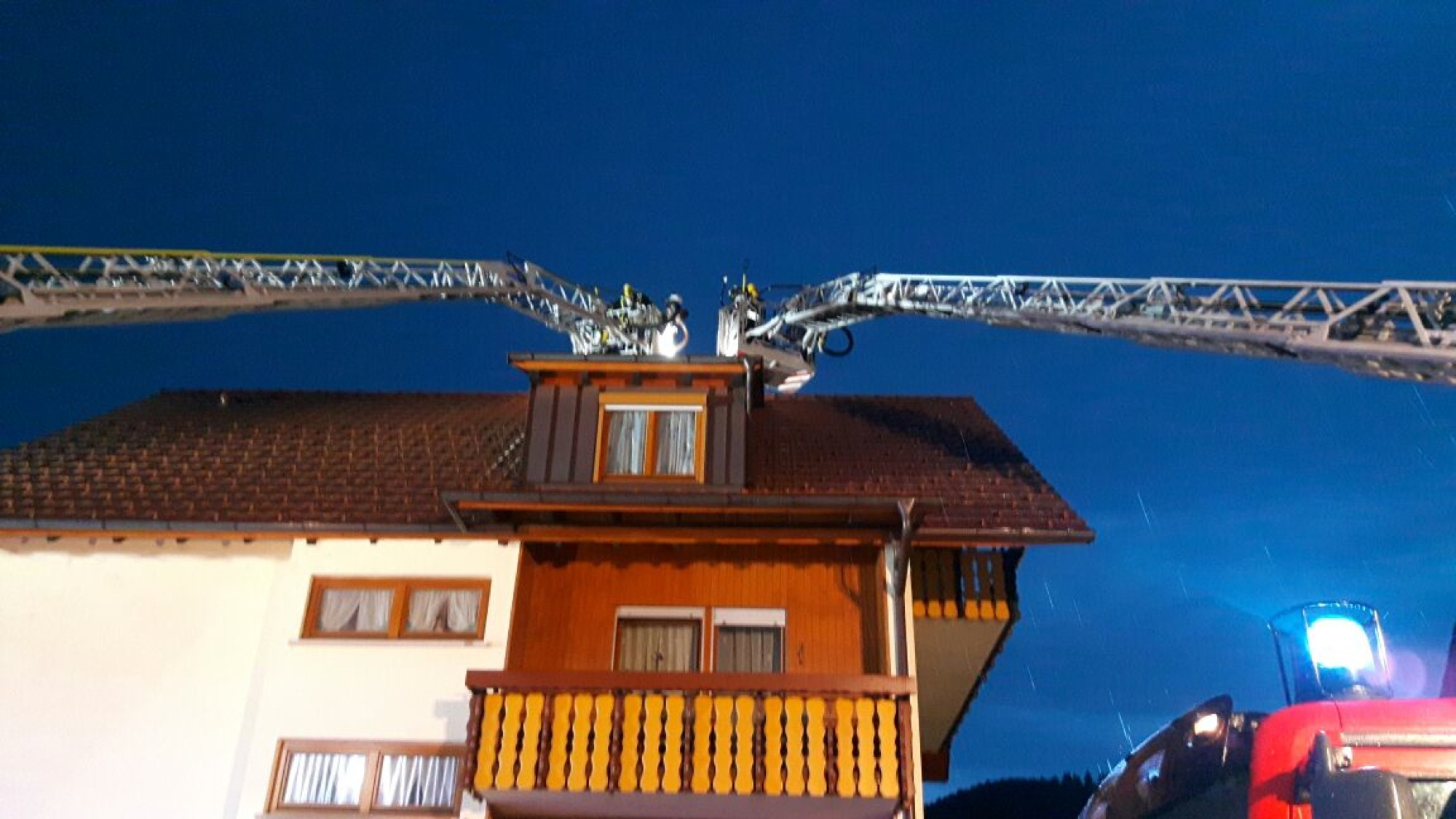 Am Freitag in der Zeit von 20.10 bis 21.15 Uhr zog ein Unwetter mit Starkregen und heftigen Windböen über den Ortenaukreis. Schwerpunkt des Unwetters lag im Bereich Offenburg und vorderes Kinzigtal. Feuerwehren im betroffenen Gebiet mussten zu unzähligen vollgelaufenen Kellern und umgestürzten Bäumen ausrücken. Durch Blitzeinschlag gerieten drei Dachstühle in Brand: Ein Wohnhaus in der Wiesenfeldstraße in Zell a. H. und je ein Wohnhaus in Offenburg-Windschläg und Offenburg-Weier waren betroffen.