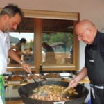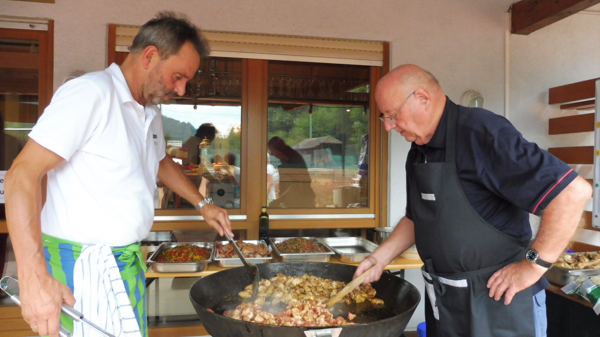 Nach dem Aperitif auf der renovierten Terrasse des Clubhauses begrüßte der Clubvorsitzende Hans-Martin Moll die Gäste. Er hob die 10-jährige Tradition des Paella-Abends hervor, stets unter der Leitung von Martin Alender und assistiert von Hans Finkenbein. Ihr Lob bekamen auch die Damen, die dazu beitrugen, dass alle mit dem Abend sehr zufrieden waren: Das Team, das für die passende spanische Tischdekoration sorgte und die Damen vom Service. Während die Paella in der Riesenpfanne langsam garte, regte ihr köstlicher Duft den Appetit der Gäste an. Und als der heftige Gewitterregen die Gäste von der Terrasse vertrieb, war die Paella servierbereit und die Gäste konnten im Clubhaus die spanische Spezialität genießen.