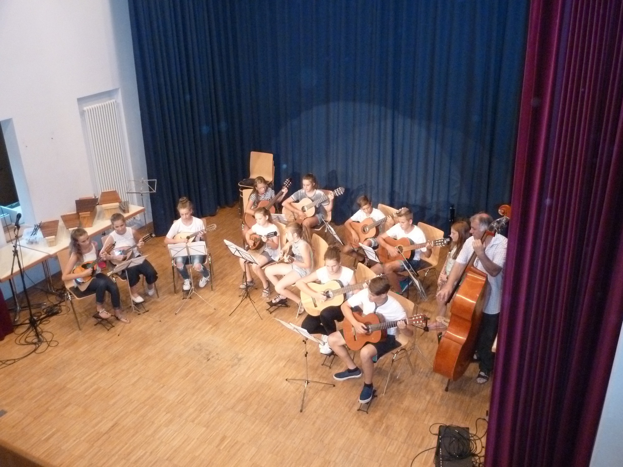 Kein Fest und keine Party ohne Musik von Discjockey David Guetta. Grund genug für die Musik-AG, den Dance-Hit »Titanium« zum Ausklang des »Musischen Abends« vorzutragen. Allerdings nicht als elektronisch aufgepeppten Partykracher, sondern in einer schlichten, nicht minder attraktiven Akustikversion mit fein abgestimmtem Gesang der Siebt- und Neuntklässler und Konrad Fees an der E-Gitarre. Trotz schweißtreibender Temperaturen, die an diesem Sommerabend im Saal herrschten, klatschte das Publikum anhaltenden Beifall.