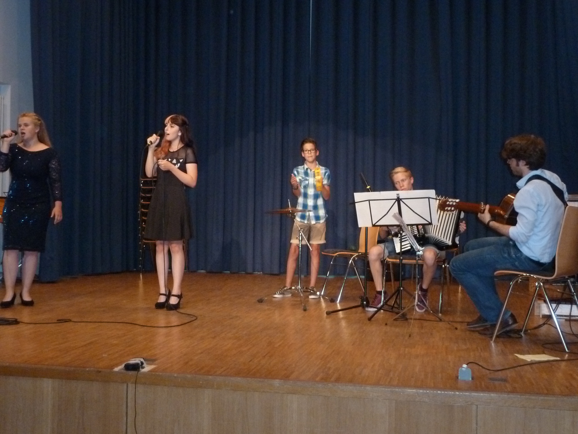 »I see fire«, ein Song aus der Feder von Teenidol Ed Sheeran begann mit den Stimmen von Elena Lehmann (R10b) und Lisa Bonomo (R10c) betont leise und steigerte sich kontinuierlich in Dynamik und Ausdruck. Passend dazu das Arrangement mit moderat verstärkter Akustikgitarre (Rainer Lietzmann) und Akkordeon (Vincent Lehmann, R8b) sowie Percussion (Tom Lehmann, R8b).