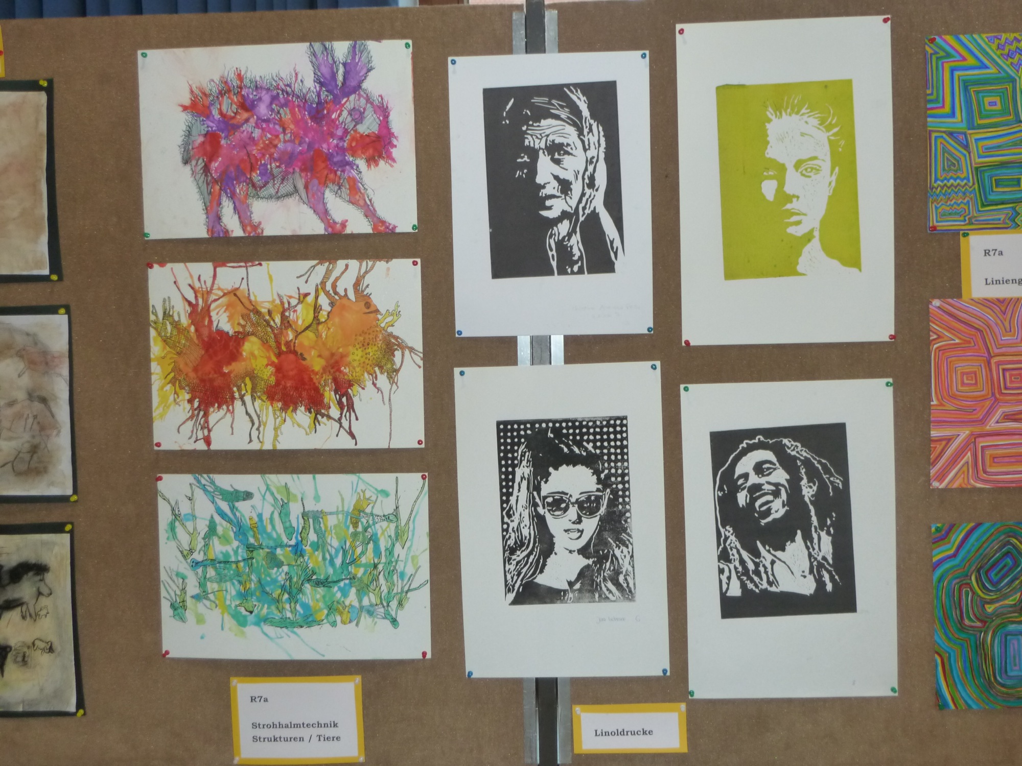 In der Pause wurden die Gäste im Kultur- und Vereinszentrum von der R7a und Klassenlehrerin Alina Mockenhaupt mit Getränken bewirtet. Viele Besucher nutzten die Zeit zudem, um sich die Ausstellung mit Arbeiten aus dem Kunstunterricht anzuschauen. Lehrerin Myriam Litterst hatte dafür eine Auswahl an Bildern zusammengestellt, die von Schülern der fünften bis zehnten Klassen angefertigt wurden.