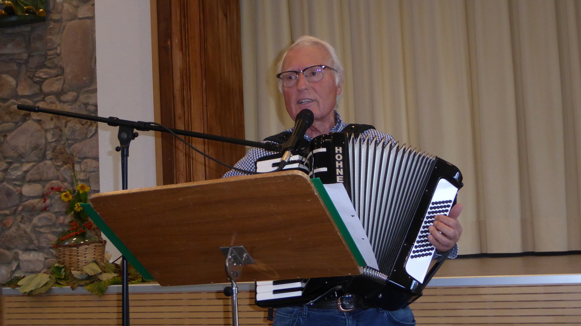 Mit angenehmer Lautstärke unterhielt Klaus Zillhardt die Senioren musikalisch mit dem Akkordeon und am Keyboard und gesanglich mit einem bunten Melodienreigen von Volksliedern und Schlagern, bei denen auch die Senioren kräftig mitsangen. Mit kleinen Geschichten und ab und zu einem Witz ergänzte und bereicherte er seinen unterhaltsamen Auftritt. Mit der Geschichte »Trau schau wem«, die vom Schirm-Tick der Tante Mechthild und ihrem Oskarle handelte, ergänzte Monika Lehmann das Programm.