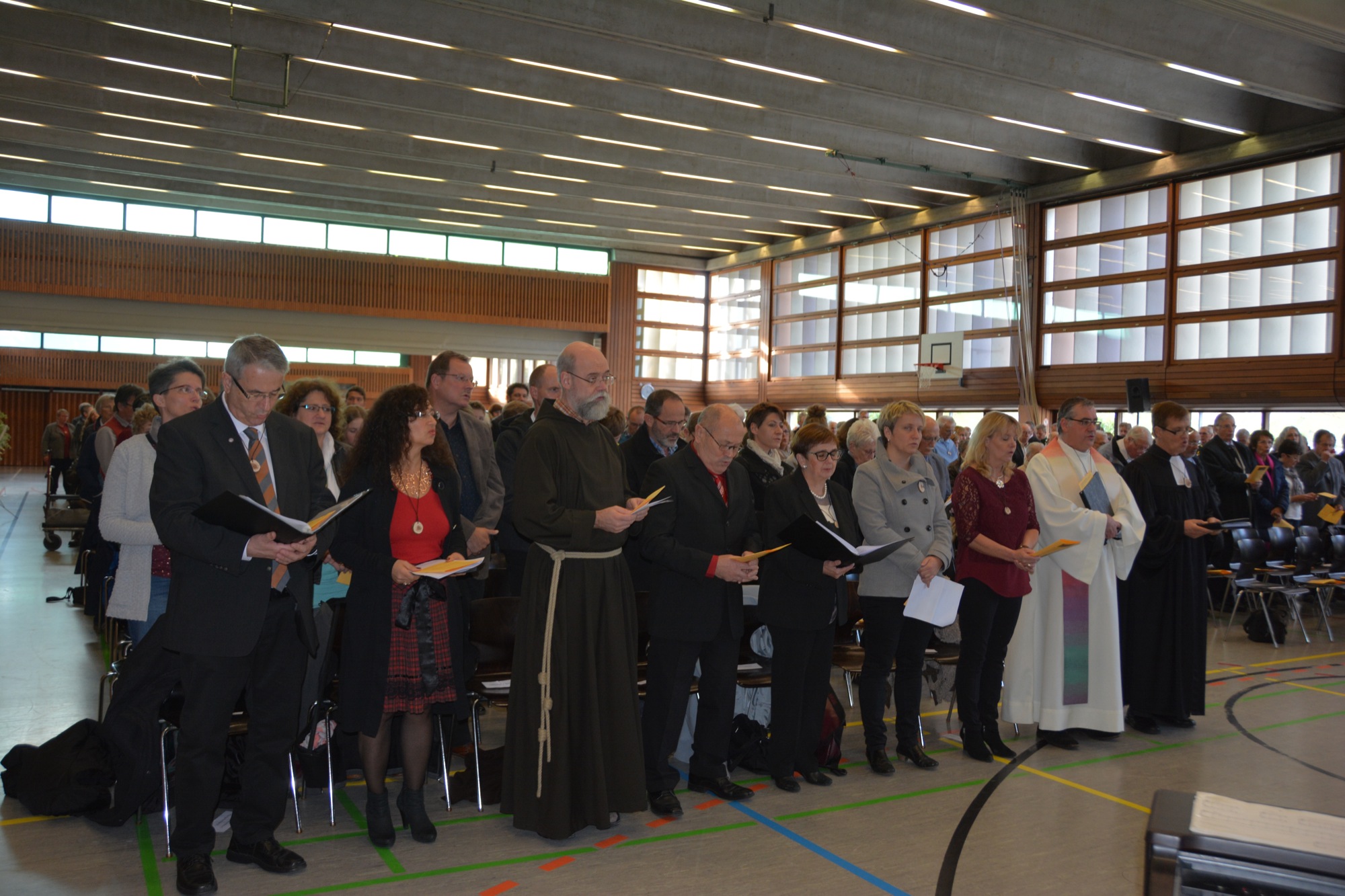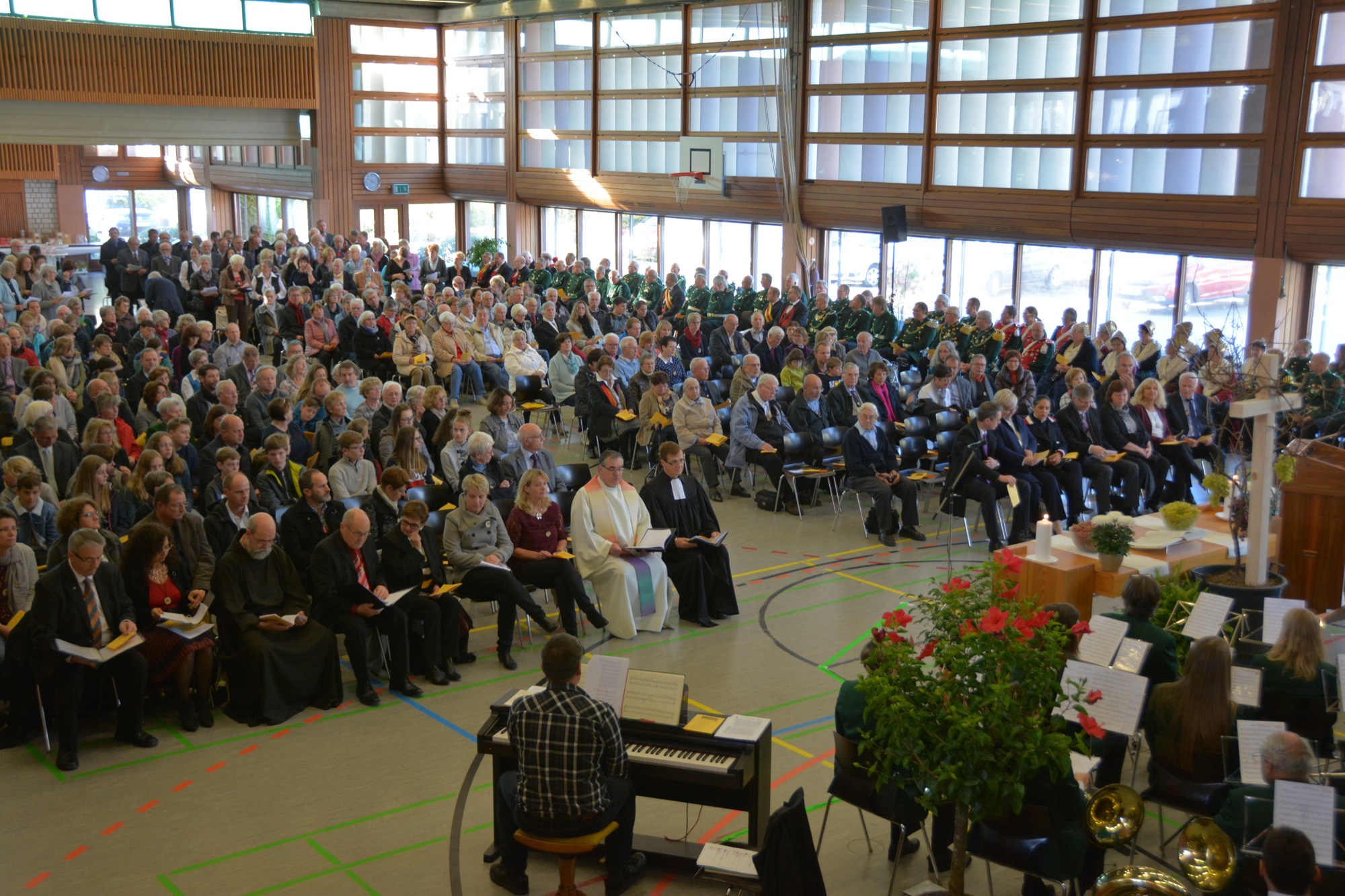 Weil der traditionelle Reformationstag am 31. Oktober in diesem Jahr einmalig zum staatlichen Feiertag erklärt wurde, bot sich die Gelegenheit zu einem großen Gottesdienst. 120 Sängerinnen und Sänger aus Kirchenchören und dem Männergesangverein Liederkranz bildeten einen gemeinsamen Chor. Die Zeller Stadtkapelle bereicherte die Stimmung mit einer Reihe eindrucksvoller Stücke. Spielmannszug, Bürgerwehr und Trachtenfrauen begleiteten die Pfarrer und Kirchenvertreter beider Konfessionen vom Rathaus zum Gottesdienst in der Ritter-von-Buß-Halle.