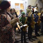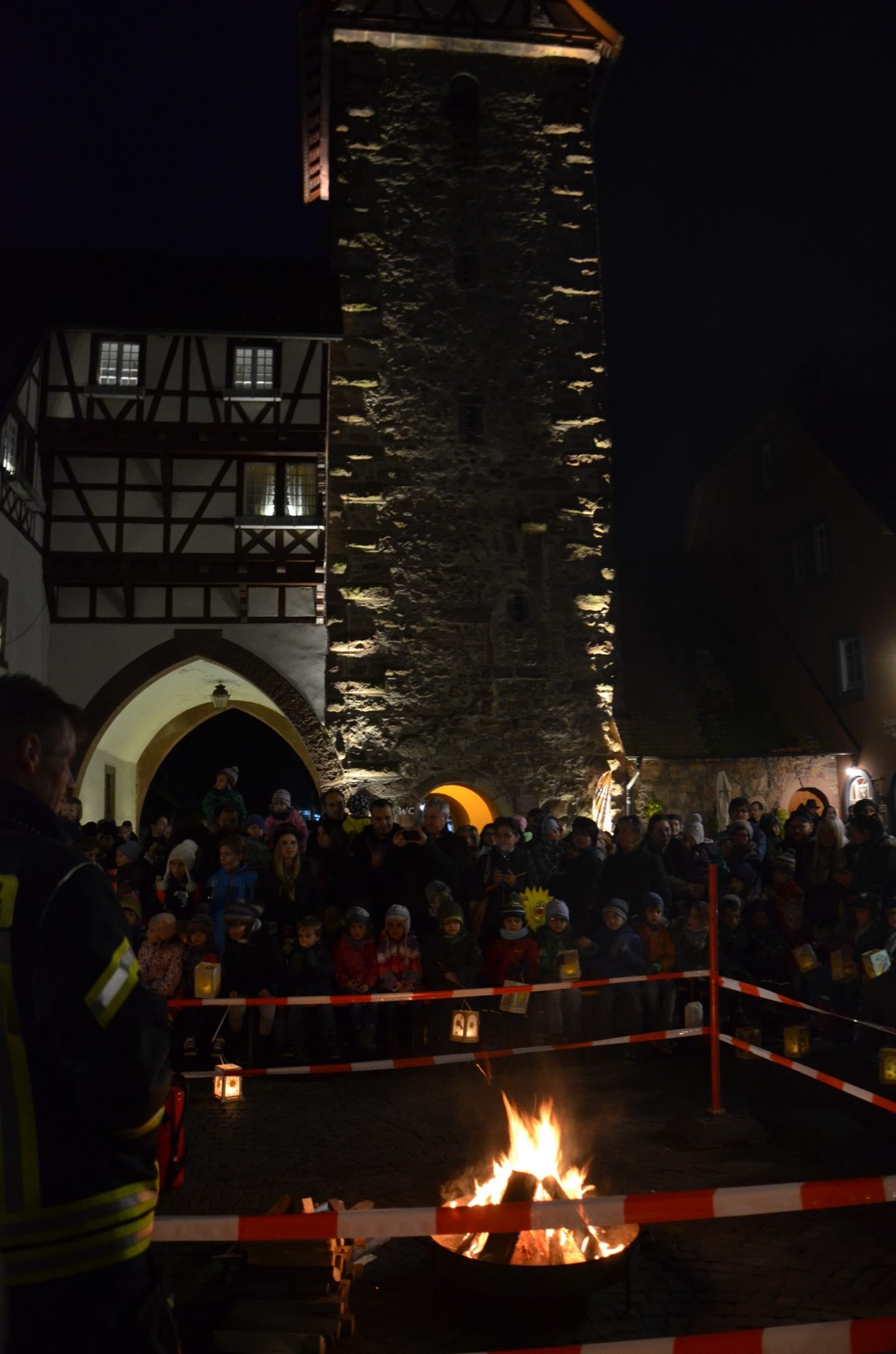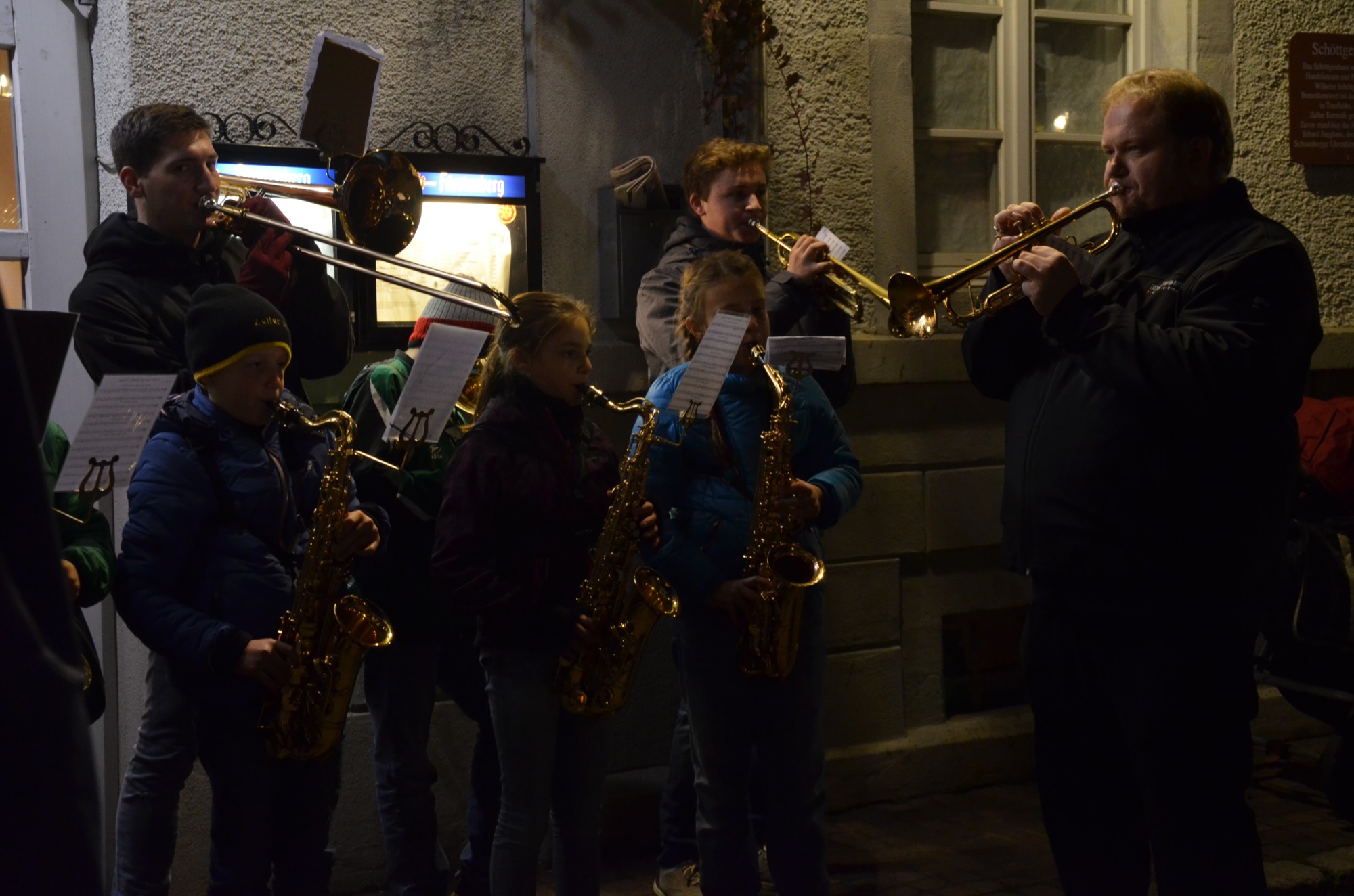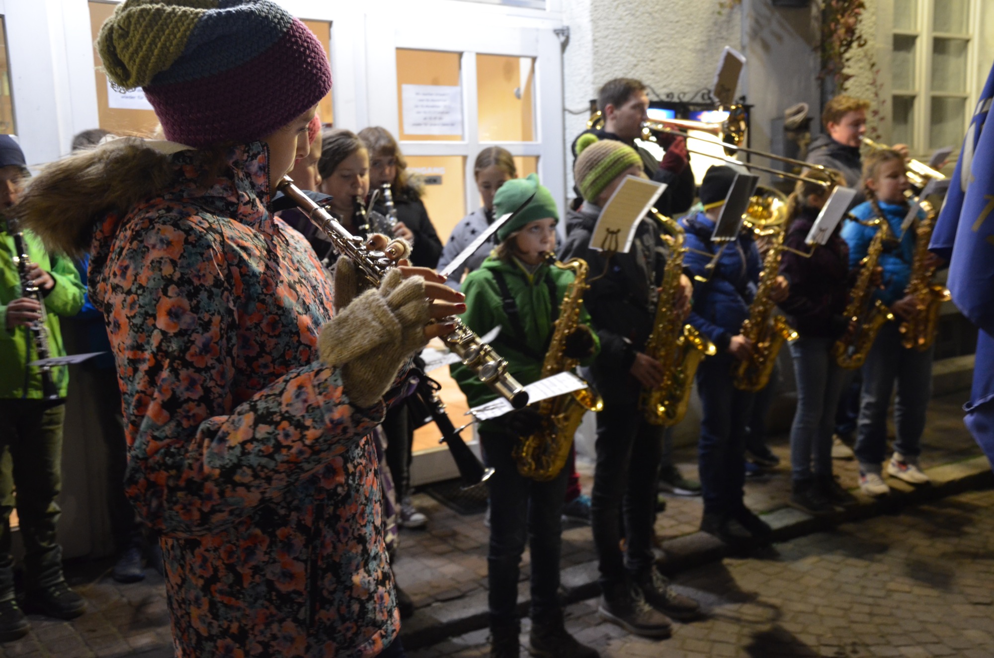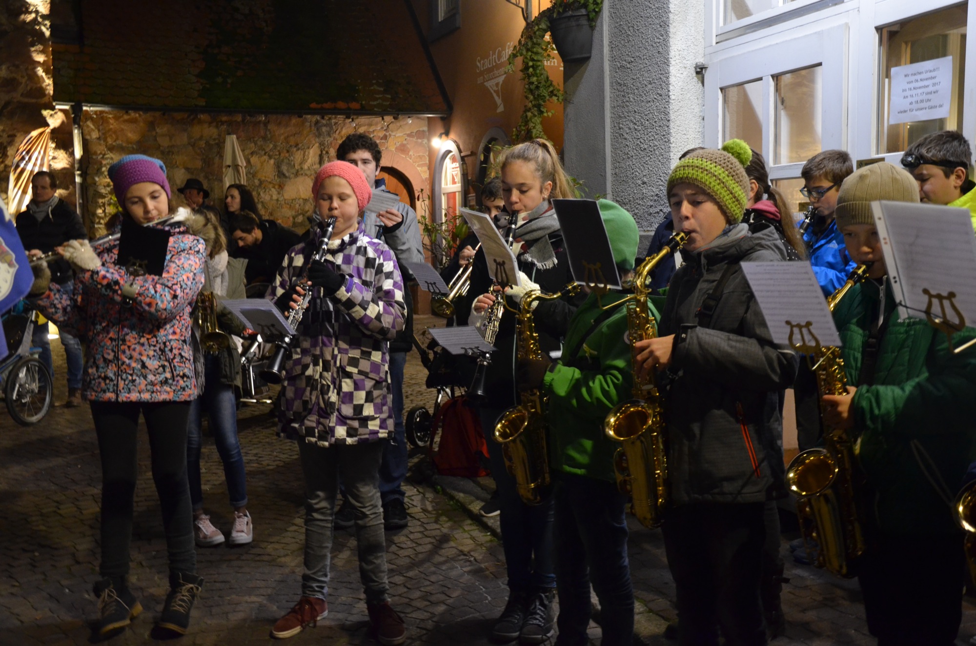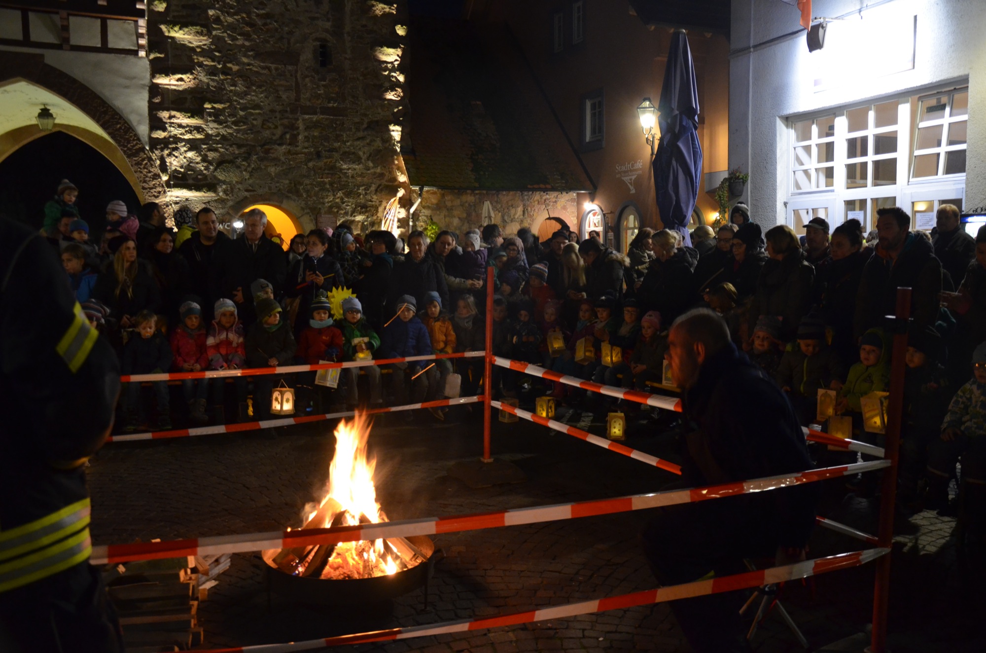 Alle Erwachsenen, die sich gestern Abend ganz nah am Martinsfeuer auf dem Kanzleiplatz aufgehalten hatten, konnten hören und sehen, dass die Kinder die Erzählungen und Verse gut verinnerlicht hatten. Sie sangen kräftig mit. Diesen Mut brachten viele Erwachsene, trotz dass ihnen die Erzieherinnen sehr gute Vorbilder waren, nicht auf. Schön, dass zur Unterstützung der Kindergartenkinder und Kindergärtnerinnen die Jungmusiker der Stadtkapelle mitgekommen waren. Ihr Spiel unter Leitung von Dirigent Stefan Polap füllte den Kanzleiplatz.
