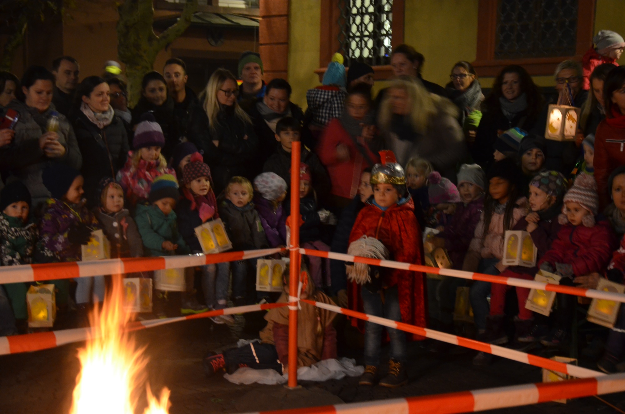 Ingrid Mattheis, Leiterin des Kindergartens, dankte allen Personen, die eine Aufgabe für die Martinsfeier übernommen hatten. Ihr Dank galt der Reiterin mit ihrem Pferd und ihrem Begleiter sowie den Musikern für ihr Spiel. Sie dankte den drei Feuerwehrmännern für das Martinsfeuer und das Sichern des Martinszug. Den selben Dank erhielten die Polizeibeamten. Mattheis dankte den Mitarbeitern des Betriebshof für die Marktstände und den Eltern, die eine Bewirtung organisiert hatten und durchführten. Dem Kindergarten wird der Erlös daraus zugute kommen.