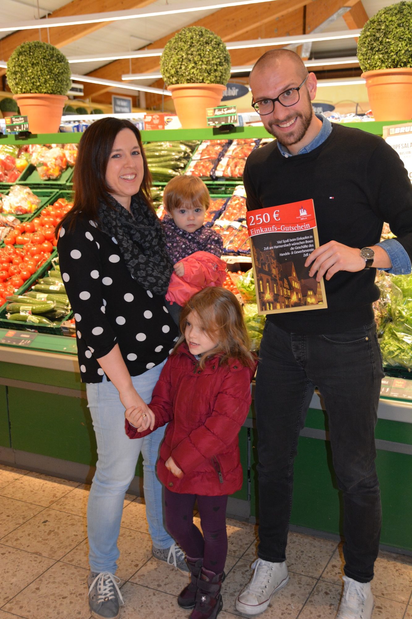 durfte bei Edeka-Markt Bruder aus den Händen von Juniorchef Sebastian Bruder einen 250-Euro-Gutschein entgegennehmen. Vor zwei Jahren hat ihr Vater Rudolf Wissmann 500 Euro gewonnen. Wenn das kein Glück ist! Beim Abholen des Hauptgewinns wurde die junge Mutter von ihren beiden Töchtern Tamara und Lena begleitet. Jetzt dürfen sich alle noch einen Extra-Wunsch erfüllen.