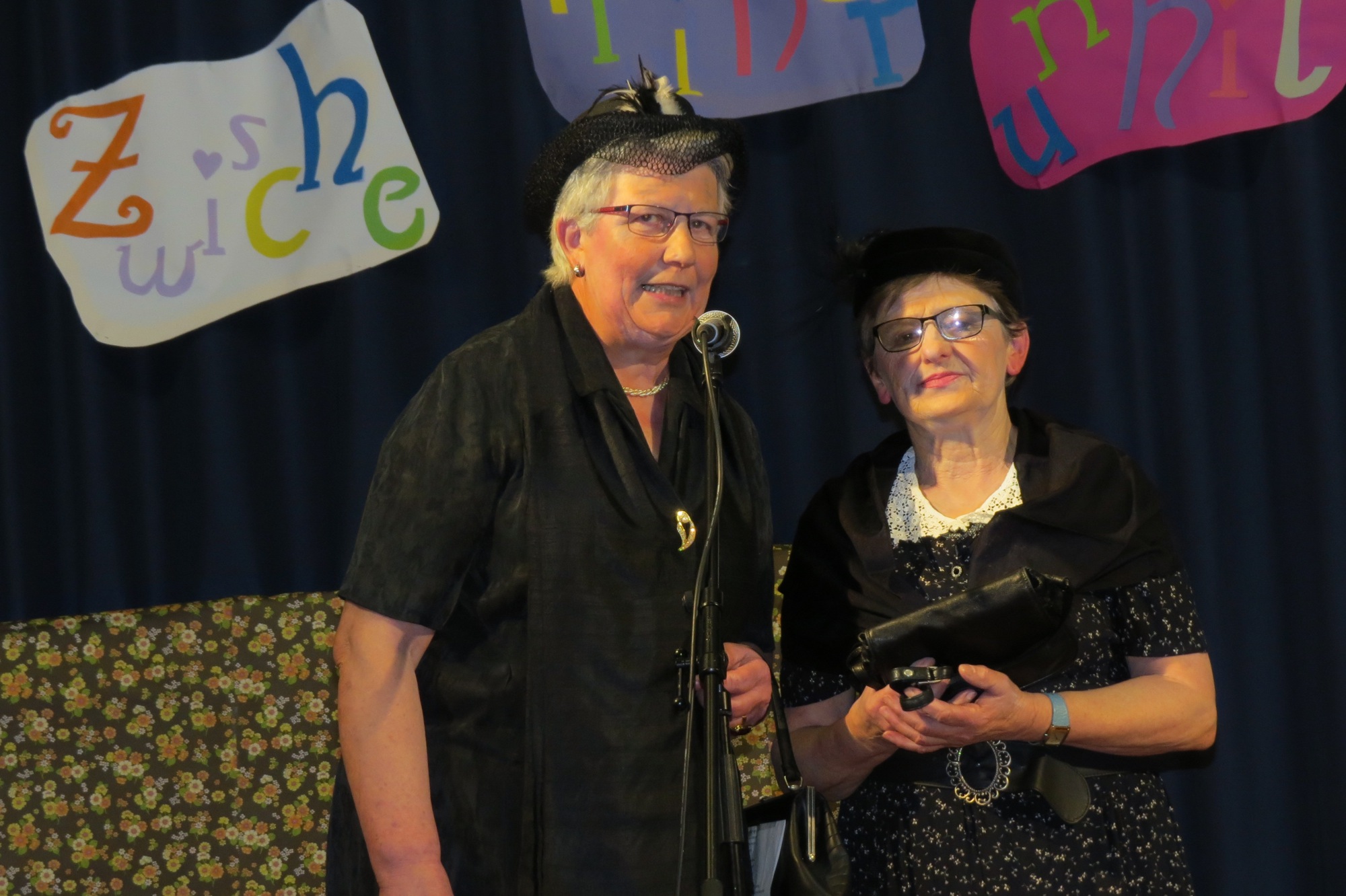 Dann kommen zwei alte Schrullen auf die Bühne (Lilo Fix und Lisbeth Uhl). Sie kennen sich im Hombe genau aus. In jedem Geschäft gibt es dort einen Stempel und die beiden sammeln eifrig. Warum gibt es eigentlich keine Stempel, wenn man in die Wallfahrtskirche zum Beten geht? Das muss dringend geändert werden, dann würden auch mehr Leute dorthin kommen. Wegen der vielen roten Ampeln im Hombe fühlen sie sich wie im Rotlichtmilieu. Im Dunkeln leuchtet es überall Rot. Der Mann von Lisbeth findet sie sexuell nicht mehr attraktiv. Da macht sie sich schick und geht fort – eine zweite Meinung einholen. Da guckt ihr Mann aber dumm aus der Wäsche. Und von der romantischen Liebe im Auto wissen sie ebenfalls zu erzählen; nur war immer der Schaltknüppel im Wege, bei diesen alten Schachteln.