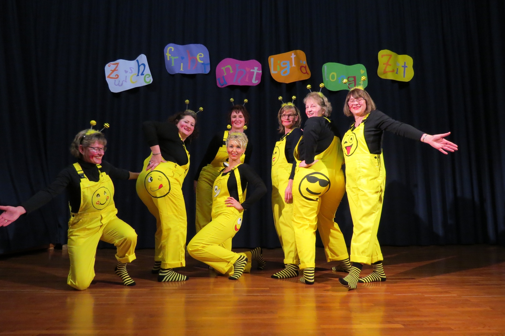 Die »Junge Frauengruppe« der katholischen Kirchengemeinde ist als »Lachlatz Maidle« verkleidet. Mit ihrem sportlichen Tanz und gelben Latzhosen bringt sie Freude ins Narrenvolk. Gern zeigt sie ihren Tanz ein zweites Mal.
