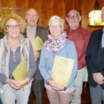 Für die Jahre ihrer Mitgliedschaft mit Urkunden und Präsenten geehrt wurden am Ende der Veranstaltung: Anna und Falk Polap (40/ 45 Jahre – »das ist ja fast schon unheimlich«, ging ein beeindrucktes Raunen durch den Raum), Klaus Schätzle (25 Jahre), Evelin Grassl und Angelika Schnell (10 Jahre), Hansjörg Metzler und Lothar Rausch (5 Jahre).