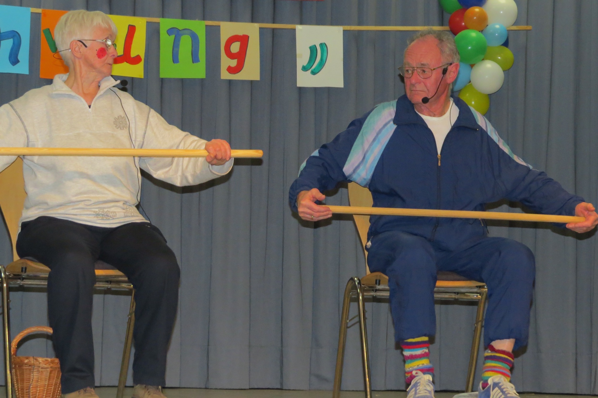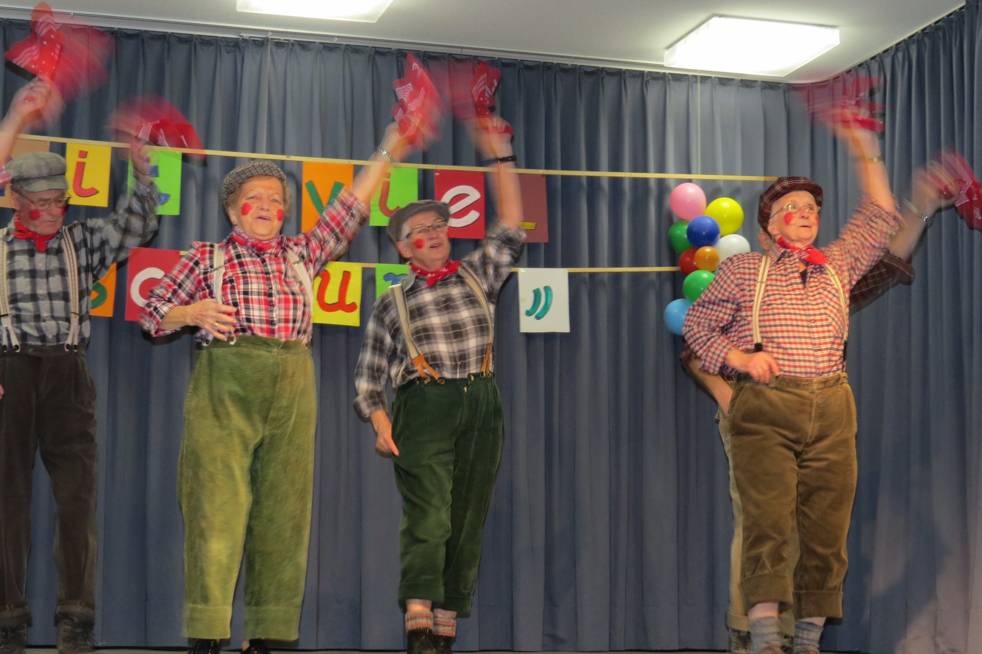 Ziemlich sportlich ging es in diesem Jahr bei der Fasend zu. Ihr Motto »Mit viel Schwung« setzten die Gymnastikgruppe und das Rentnerbänkle mit närrischen Ideen um. Die Mittwochsturnerinnen unter Leitung von Brigitte Armbruster tanzten zum Lied von Andreas Gabalier »Hulapalu« – da war Tempo drin! Und nach der Zugabe kamen die Senioren schon etwas aus der Puste, brachten die sieben Tänzer im typischen Volksrock’n’Roller-Kostüm doch zusammen 540 Lebensjahre auf die Bühne. Das Publikum war begeistert und spendete reichlich Applaus.