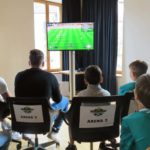 Hauptattraktion war das Fußballturnier. Sebastian Mayer von der Fa. Agil Event hat das Turnier organisiert. »Es ist wie die Weltmeisterschaft aufgebaut«, informierte er auf Nachfrage. »Wir simulieren die WM.« Es gab folglich acht Gruppen mit vier Mannschaften. Jeweils vier Spieler saßen an der Konsole, weitere Teilnehmer unterstützen durch Wortbeiträge. Auf vier Großbildschirmen liefen die Fußballspiele gleichzeitig und die Zuschauer konnten zwischen den einzelnen Spielen wechseln. Der jüngste Teilnehmer war 9 Jahre alt, der Älteste 26 Jahre. »Damit treffen wir den Nerv der Zeit«, freute sich Sebastian Mayer über die gute Resonanz.
