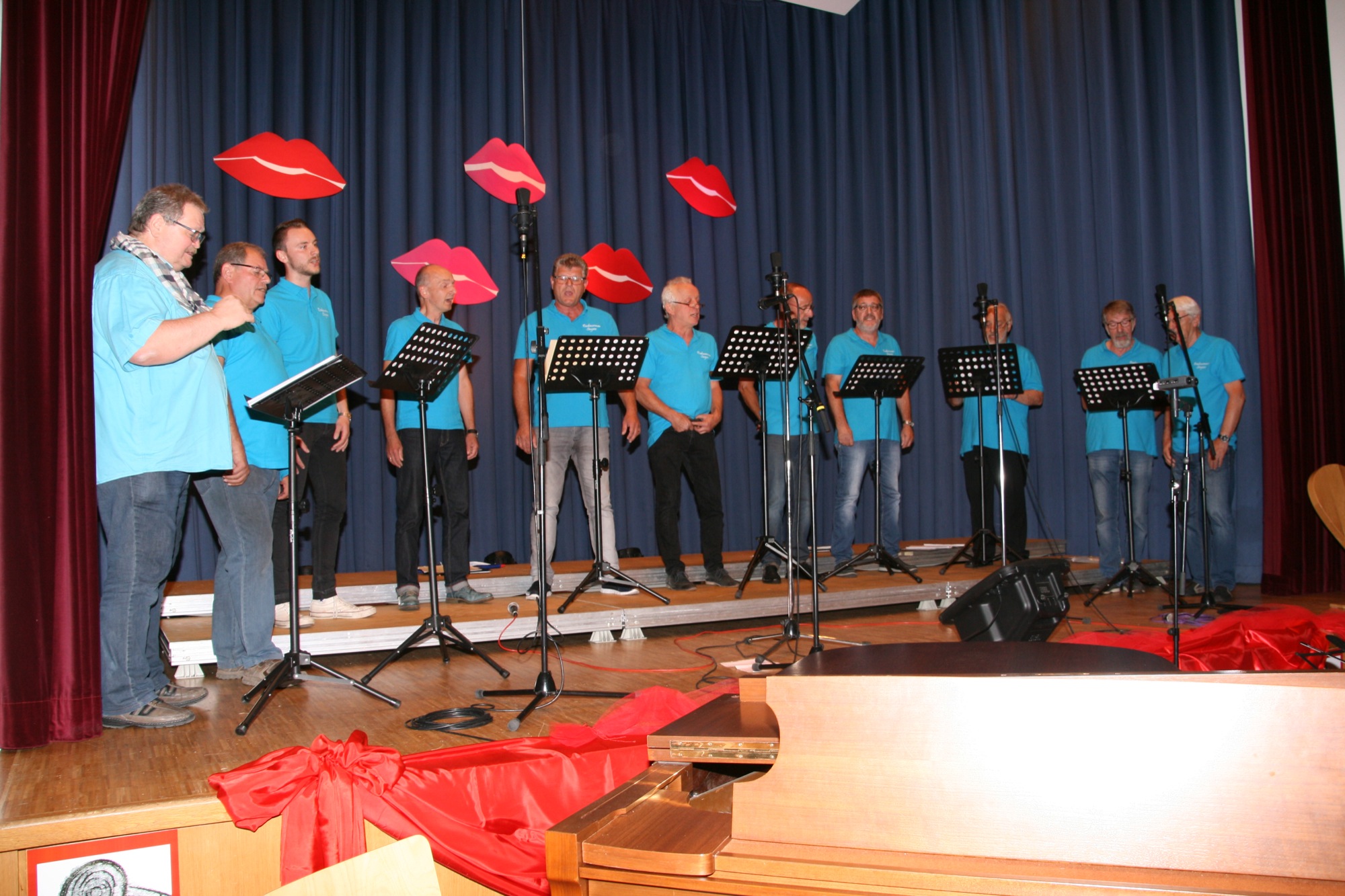 Von den legendären Wise Guys stammte auch das Lied vom »Engel«, der einen überall hin begleitet. Simon Esslinger übernahm in bewährter Weise die Rolle des Vorsängers. Von ihm wurde solistisch auch das Chanson »Paris« dargeboten, das ein hübsches Rendezvous mit Sprachproblemen beschreibt. Dass der Chor dabei die fehlende instrumentale Begleitung mit eigenen Stimmen zu ersetzen vermag, beweist seine musikalische Qualität. Den Schlusspunkt setzten die Sänger mit dem Song »Männer« von Herbert Grönemeyer. Letzterer wurde von Thomas Dreher mit einem Staccato unübertroffen nachgeahmt.