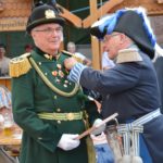 Landeskommandant Hans-Joachim Böhm heftete seinem Vorgänger gestern nun ein weiteres Ehrenzeichen an die Uniform: das Treuedienstabzeichen des Landesverbandes für 60 aktive Jahre. Bernhard Lehmann habe es in seiner Bilderbuchkarriere in den Reihen der Bürgerwehren vom Schützen bis zum obersten General gebracht. Aber nicht nur mit seinem Engagement habe sich Bernhard Lehmann ausgezeichnet, sondern auch mit seinen menschlichen Qualitäten, betonte Oberst Böhm: »Stets gradlinig und zuverlässig, im Ton verbindlich und freundlich.« Es sei für ihn eine wirklich große Ehre, einen solch heimatverbundenen Mann auszeichnen zu können.