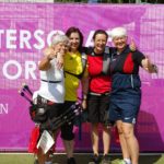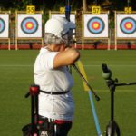 Auf dem Sportplatz des TUS Dotzheim waren 58 Scheiben auf verschiedene Distanzen aufgestellt. 232 Schützen, davon 31 Damen in der Masterklasse Recurve gingen am Freitagmorgen an den Start, um um ihren Meistertitel zu kämpfen. Bei sehr warmen Temperaturen und leichtem Wind begann der Wettkampf um 9 Uhr. Im Laufe des Vormittags nahmen die Windböen zu und die Luft heizte sich immer mehr auf. Doch der erste Durchgang lief für Sabine Herm gut und sie lag im vorderen Drittel auf Platz 9. Im zweiten Durchgang verstärkten sich die Windböen. Dies erschwerte es zunehmend eine gute Passe zu schießen. Zwar versuchten die Schützinnen die Böen abzuwarten. Das gelang aber nicht immer, denn für eine Passe mit sechs Pfeilen hatte man exakt vier Minuten Zeit. Am Ende lief es unter dem Strich ganz gut und Sabine Herm beendete ihre erste Deutsche Meisterschaft mit einem sehr guten 13. Platz mit 573 Ringen im vorderen Drittel.
