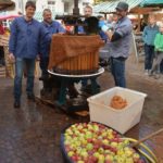 Nach alter Väter Sitte haben die Neuhauser Mostbuebe vor den Augen vieler Passanten den Apfelmost gepresst. Im Zuber wurden die Äpfel gewaschen und danach in der alten Ritter-Mühle geschnetzelt. Eimer für Eimer wanderten die Äpfel in die Trotte, ehe sie dann mit Muskelkraft ausgepresst wurden. Je Füllung flossen rund 50 Liter des süßen Saftes in den Eimer und wurden dann direkt auf dem Markt verkauft.