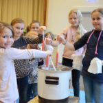 An den verschiedenen Basteltischen entstanden Schneeeulen aus Kiefernzapfen, Türschilder aus Naturmaterialien, Filzanhänger, Drahtsterne, Elche mit Lutscher, Tannenbäume im Glas, Sterne aus Papiertüten und Kerzen im Wachsbad.