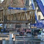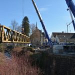 Der Baufortschritt bei der Sanierung der Ortsdurchfahrt Unterharmersbach ist mit dem Rückbau der Behelfsbrücke bei der Wallfahrtskirche um einen weiteren Mosaikstein sichtbar geworden. 10 THW-Helfer aus Biberach und vom Brückenzug Müllheim waren am Samstagvormittag im Einsatz, als die Brücke mit zwei Lastkränen aus den Widerlagern gehoben und auf dem Platz vor der Wallfahrtskirche abgelegt wurde.