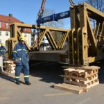 Am Samstag ging es nun in umgekehrter Reihenfolge. Wieder kam die Brücke an die Haken von zwei Lastkränen. Allerdings waren weit weniger Zuschauer gekommen, um von der Lindenbrücke und vom Vorplatz der Wallfahrtskirche aus die Aktion zu verfolgen. THW-Ortsbeauftragter Hans-Jörg Sorychta und THW-Ehrenlandessprecher Walter Nock waren vor Ort und begleiteten den Einsatz, der völlig reibungslos abgelaufen ist. Nur kurzzeitig musste der Verkehr auf der L94 zur Sicherheit angehalten werden. »Für unsere THW-Helfer aus Biberach ist der Einsatz etwas Besonderes, für den Brückenzug aus Müllheim ist es Routine«, stellte Walter Nock fest. Regelmäßig werden vom THW Brücken auf- und abgebaut.