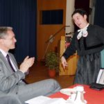 Dafür hingegen, dass immer wieder reichlich Lachtränen flossen, sorgte Michaela Neuberger als »Zetzel«. Mit hinreißend humoriger Herzenswärme, unbedingter Publikumsnähe und vollem Körpereinsatz erzählte sie, was die Alten einst von Zell erzählten. Und überreichte dem AWO-Ortsvorsitzenden abschließend eine St. Benediktus-Medaille – zum Schutz, »damit Sie Ihre Arbeit noch lange fortführen können«. Stellvertretend für den gesamten Saal stellte der AWO-Ortsvorsitzende betreffs der Zetzel in seinem Abschiedswort fest: »Ich bin begeistert.