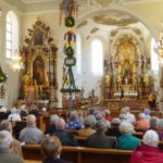 Bei der im Gasthaus »Rössle« zunächst gemachten Kaffeepause wurden die Seniorinnen und Senioren mit frischgebackenem Erdbeerkuchen, Käsesahne und Schwarzwälder Kirschtorte verwöhnt. Die nur wenige Meter entfernte Klosteranlage mit der Pfarr- und Wallfahrtskirche »Mariä Himmelfahrt« war gut zu Fuß und mit Rollator zu erreichen. Durch den Klosterhof an der Kirche angekommen versammelten sich alle in derselben, um mit Br. Pirmin und dem Altenratsteam gemeinsam eine kleine Besinnung und Maiandacht zu feiern.