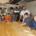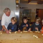 Es wurde gemeinsam ein süßer Hefeteig hergestellt. Zuerst widmete sich die Gruppe aber dem salzigen Hefeteig, der schon vorbereitet da stand. Jedes Kind lernte unter fachkundiger Anleitung durch Josef Roth und mit Hilfe des Bäckergesellen Mathias Roth und des Lehrlings Tobias Vollmer selbst eine Brezel, einen Laugenzopf oder einen Laugenknoten zu formen. Aus dem dritten Teigstück durfte jedes Kind seine eigene Kreation formen. Die Laugenteile wurden anschließend mit Lauge geduscht und kamen in den Ofen. Inzwischen haben die Kinder gelernt, wie aus drei süßen Hefekugeln, die mit dem Brötchenportionierer gleichmäßig vorgeformt wurden, zwei Hefehäschen werden können. Jedes Kind hat seine Häschen mit Hagelzucker, Rosinen, Schokolinsen oder Streuseln verziert. Während das Gebäck im Ofen fertig gebacken wurde, haben die drei Bäcker den Kindern noch verschiedene Flechtzöpfe oder Schaustücke für Prüfungen gezeigt.