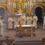 An Mariä Himmelfahrt werden die schönen Marienlieder im liturgischen Ablauf der Feier gesungen. Der Kirchenchor unter Leitung von Wolfram Dreher zeigte mit seinem Gesang, wie schön die Stimmen im großen Kirchenraum klingen. Das »Magnificat« von Alan Wilson sang der Chor in der deutschen Fassung von Matthias Degott. Damit griff der Chor thematisch genau das Loblied auf, das Marinus Parzinger im Evangelium und in seiner Predigt beschrieben hatte. Diesen musikalischen Höhepunkt der Feier gestaltete Wolfram Dreher in harmonischem Zusammenspiel der Stimmen Sopran, Alt, Tenor und Bass, die die prägnante Melodie abwechselnd zu Gehör bringen. Zu Beginn sang der Chor die beiden Choräle »Kyrie« und »Gloria« aus der Messe in C von Anton Bruckner. Während das »Kyrie« in tiefer Tonlage getragen und piano vortragen wurde, war das »Gloria« durch Tempowechsel, Solopart der Männerstimmen und einem fulminanten Höhepunkt (»Qui tollis«) geprägt. Am Ende der Feier zeigte der Chor mit dem »Sanctus« aus der Deutschen Messe von Franz Schubert nochmal sein ganzes Können. Organist Dieter Benson begleitete den Kirchenchor auf der Orgel. Zur Kommunion der Gemeinde spielte er die festliche Bach-Kantate »Wir danken dir«.