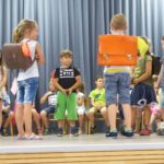 Zu Fuß vom Kindergarten ins Pfarrheim gewandert waren die Schulanfänger. Sie eröffneten im Kreis sitzend ihr Programm mit dem Lied „ Bei uns wird heut gefeiert“.