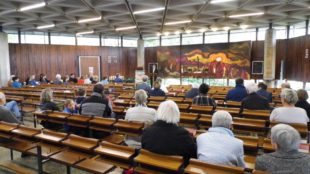 Blick auf die gut besuchte Gemeindeversammlung in der evangelischen Kirche.