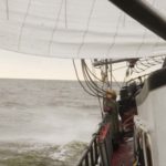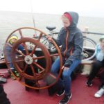 Donnerstagmorgen hieß es wieder früh aufstehen, frühstücken und alle Mann an Deck, ablegen und außerhalb des Hafens Segel setzen. Dies war bei Windstärke 7 eine echte Herausforderung. Unser Schwarzenegger-Team hatte heftig zu kämpfen und sie brauchten tatsächlich zum ersten Mal Unterstützung. Auch das Hissen des Vorsegels brauchte alle Kräfte. Über Nacht hatte der Wind gedreht und er kam nun aus Nordwest. Das bedeutete relativ ruhiges Segeln, da der Wind von Raumschots, das heißt halb von hinten kam. Unruhig waren nur die Wellen, die heute eine Höhe von ein- bis eineinhalb Meter erreichten. Raumschots heißt aber auch, dass es ein sehr schnelles Segeln ist. Mit acht bis neun Knoten (1 Knoten = 1 Seemeile = 1,852 km) ging es Richtung Heimathafen Enkhuizen.