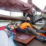Am Sonntag, den 1. September trafen wir uns am Bahnhof in Biberach, um nach Holland ans Ijsselmeer zum Segeln zu fahren. Wir waren acht Jungs und sieben Mädchen. Außerdem waren Heinz, Tobias und Paula als Betreuer dabei. Das erste Mal in unserem Leben waren wir auf dem Weg zu einem Segeltörn. Ziel war Enkhuizen am Ijsselmeer in Holland. Acht Stunden dauerte die Bahnfahrt, bei der wir sechs Mal umsteigen mussten. Wir hatten trotzdem Spaß beim Kartenspielen und nutzten die Zeit mit unseren Handys. Wir wussten ja aus den Vorbesprechungen, dass der Handygebrauch auf dem Schiff eingeschränkt sein wird. Am Abend sind wir wohlbehal-ten angekommen. Zunächst brachten wir unser Gepäck auf das Schiff, das noch gereinigt wurde und gingen dann erst mal zum Pizzaessen. Danach konnten wir es kaum erwarten auf das Schiff zurückzukommen und unsere Kojen zu beziehen. Mit so wenig Platz in den Kajüten hatten wir nicht gerechnet. Es war ziemlich eng, was uns aber nicht weiter störte.