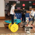 Alle Schüler, außer die, die gerade im Praktikum sind, hatten für Matthias Demmel ein kreatives Programm einstudiert. Die SMV hatte eine Umfrage in der Schule gestartet, deren Ergebnisse sie dem neuen Schulleiter mitteilte. Der kündigte an, die Gedanken weiterzuverfolgen. Die G1 machte sich Gedanken darüber, »was Herr Demmel braucht …«, die G2 hatte einen fetzigen Buchstabentanz in die Aula gewirbelt, die G3 eine Schatzkiste mit vielen Wünschen dabei und von der H1 gab es eine Schultüte voller Überraschungen, in der – ganz lebenspraktisch gedacht – sogar Taschentücher nicht fehlten »falls Ihnen mal zum Heulen ist«. Der Zirkus Karambolage hatte groß aufgefahren und Artisten und Feuerspucker zeigten ihr Können. Das Kollegium brachte eine handfeste Stärkung mit und »Blumen für die Frau«.