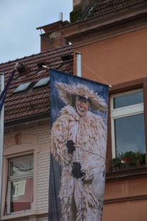 Große Fahnen mit den vier Zeller Narrofiguren vor dem Rathaus und beim Kreisverkehr sowie bunte Wimpelbänder über der Hauptstraße künden nun die Fasend an.