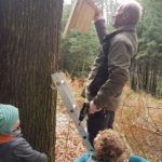 Die Kinder nahmen Holzreste vom Hüttenbau und zeichneten die einzelnen Teile auf Bretter auf, die sie anschließend aussägten. Danach wurden die Einzelteile zusammengeschraubt und als Schutz eine Leinölschicht aufgetragen. Nun kam die Frage auf: Wer kann uns denn helfen sie aufzuhängen und sagen wo der richtige Standort ist? Die Kinder kamen gleich auf Förster Pfundstein. Sie riefen ihn an, erzählten ihm von ihrem Projekt und baten ihn doch vorbeizukommen, um ihnen zu helfen. Einige Tage später war es dann soweit: Die Kinder konnten gemeinsam mit Klaus Pfundstein zwei Nistkästen in der Nähe der Hütte aufhängen. Einer der beiden Nistkästen wurde schon gleich belegt.
