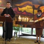 Bruder Pirmin vom Kapuzinerkloster überbrachte seine Grüße stellvertretend für die katholische Seelsorgeeinheit. Sein erster Kontakt zu der Jubilarin geht auf das Jahr 1982 zurück, als er dort mit Ministranten zu einem Workshop eingeladen war. Seidem ist er ein gern gesehener Gast in dieser Kirche und hat schon 6 mal an Buß- und Bettagen, gemeinsam mit Pfarrer Monninger, gepredigt. Begleitet von Brigitte Metzler vom Gemeindeteam überbrachte er eine Kerze als Gruß von den katholischen Schwestern und Brüdern.