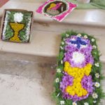 Am Ende der Feier wies Bruder Pirmin auf die kleinen Blumenbilder im Altarraum hin. Kommunionkinder hatten zum Fronleichnamsfest eigene Blumenteppiche in Miniformat auf Karton gestaltet und mit in die Kirche gebracht. Blumen im Pizzakarton – warum nicht?