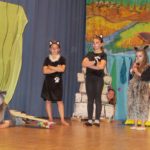 Die Kinder der Altersgruppe 4 bis 9 Jahre zeigten eine lehrreiche Tiergeschichte. Zunächst streiten sich zwei Bärenmädchen, wer von ihnen der stärkere Bär ist. Die beiden Katzen holen die weise Eule, die einen Ausweg weiß: Beide Bären sind gleich stark. Dann kommen zwei Wölfe auf die Bühne, die sehr hung rig, aber auch müde sind und bald einschlafen. Sie werden von Bienen und Schmetterlingen umflogen und dadurch aufgeweckt. Durch ein Gewitter geraten alle Tiere in Aufruhr und nach einem Blitz fällt eine Tanne direkt auf eine Wölfin und begräbt sie unter sich. Verzweifelt ruft sie um Hilfe. Verschiedene Tiere kommen vorbei – doch der Wölfin helfen? Wo diese doch immer gemein zu ihnen war und sie sogar fressen wollte! Das bringt die Wölfin zum Nachdenken: War ich wirklich so böse, dass mir jetzt keiner helfen will? Dann werde ich mich ändern, denkt sie sich. Die lieben Katzen lassen sich schliesslich überreden und räumen den umgestürzten Baum zur Seite, die Wölfin ist wieder frei. Dann will die Wölfin doch tatsächlich die Katzen auffressen… bis die weise Eule mit ihrer Sekretärin, die Fledermaus, einschreitet und der Wölfin das Versprechen abringt, nicht mehr so böse und gemein zu sein. Damit ist die Geschichte zu Ende und alle Akteure zeigen einen fröhlichen Tanz.