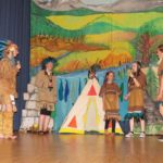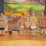Die Altersgruppe der 10- bis 14-jährigen Kinder zeigte das Stück »Chaos im Indianerdorf«. Mit Indianergeheul stürmen die Akteure die Bühne und zeigen erstmal einen Indianertanz. Der Indianerhäuptling ist immer unzufrieden. Er hat »nur zwei Töchter« und hätte lieber einen Sohn gehabt: »Mädchen sind zu nichts zu gebrauchen. Ich will auf Bärenjagd gehen – doch mit wem?«, ärgert sich der Häuptling. Einige Indianerkinder gehen in den Wald zum Beeren sammeln. Daraus mixen sie einen Zaubertrank, den die Töchter des Häuptlings mitnehmen, um damit wilde Pferde zu zähmen. Zwei Pferde bringen sie mit als Geschenk für ihren Vater, doch dem sind die Pferde zu klein. Daraufhin bekommt er Ärger mit seiner Frau. Inzwischen sind die beiden Bären ebenfalls im Wald unterwegs und sammeln Honig. Davon erfährt auch der Häuptling und bekommt Appetit auf Honigbrot. Seine Tochter Rivana hat von den Bären und den Bienen gehört, geht ebenfalls dahin und besänftigt die Bienen mit guten Worten. Sie geben ihr daraufhin Honig, den Rivana zu ihrem Vater, dem Häuptling, bringt. Doch der will sie auch dafür nicht loben, trotz Aufforderung von seiner Frau und Großmutter. Da muss die Tochter erst von den Katzen und Wölfen entführt werden, damit er erkennt, dass sie in Gefahr ist und ihm fehlt. Er kämpft mit den Tieren und kann Rivana zurückerobern: Chaos im Indianerdorf. Der Häuptling ändert endlich seine Meinung und sagt: »Meine Tochter Rivana war mutig und wenn der Stamm einen neuen Häuptling braucht, wird es vielleicht eine Frau, eine ›Häuptline‹.« Über diesen Sinneswandel freuen sich alle und tanzen miteinander einen Indianertanz.