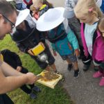 Um Antworten auf die Fragen zu bekommen machte sich die Kinderschar mit ihren Erzieherinnen auf den Weg nach Stöcken zu einem Bienenfachmann. Schon die Reise dahin war ein kleines Abenteuer. Mit dem Bähnle nach Biberach. Dann mit dem Bus nach Stöcken und schon war man da – bei Bienenmartin’s Imkerei. Imker Martin Isenmann legte gleich los. Zuerst einmal erklärte er alles Wissenswerte rund um die Bienen – den Aufbau des Bienenstockes, den Arbeitsalltag einer Biene und die damit verbundene Honigproduktion. Die Kinder hörten fasziniert zu. Begeistert waren sie auch von den vielen Gerätschaften, die ein Imker braucht. Anschließend durften die Kinder aktiv werden. Ausgestattet mit einem Imkerhut ging es zum Bienenkasten. Die Mutigen konnten die Waben mit den Bienen halten. Auch die Bienenkönigin wurde von den neugierigen Kindern entdeckt. Zum Abschluss wartete auf alle im Schleuderraum ein leckeres Honigbrot. Frisch gestärkt machte sich die Gruppe auf den Heimweg. An dieser Stelle ein herzliches Dankeschön vom Kindergarten an Martin Isenmann für den tollen Vormittag bei den Bienen.