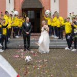 Die Fußballer des ZFV mit Kapitän Lucas Halter und Vorstand Christian Pristl bildeten für ihren langjährigen aktiven Mitspieler Matthias Heizmann (seit 2007) und seine Braut Julia ein Rosenspalier und forderten das Paar zum Toreschießen auf.