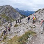 Die Anfahrt am Bodensee vorbei, durchs Allgäu war nicht allzu lang, so dass die Wanderfreunde schon vormittags in Mittelberg eintrafen. Noch bevor die Zimmer bezogen waren, fuhren sie mit der Seilbahn von Mittelberg auf die Bergstation Walmendinger Horn. Nach einem halbstündigen Anstieg war der Walmedingerhorn-Gipfel auf 1.990 Höhenmeter erreicht. Der Aufstieg wurde mit einem herrlichen Rundumblick bei schönstem Wetter belohnt. Die Sonne strahlte die umliegenden Berge wie Ifen, Grünhorn, Güntlerspitze, Widderstein und die Kanzelwand an. Ein Teil der Gruppe wählte den Abstieg über die Stutz-Alm nach Mittelberg, der Rest fuhr wieder mit der Seilbahn ins Tal, wo im Apart Hotel in Mittelberg Quartier bezogen wurde.