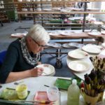 So auch hat es die Zeller Keramikmalerin Erika Börsig (63) gelernt. Sie malt den »Altländer Apfel«, für einen Kunden aus Hamburg. Dazu gehört, mit dem Pinsel auf dem sich auf der Scheibe drehenden, gut zentrierten Teller Ringe aufzubringen, die sowohl in der Breite als auch in der Farbstärke gleichmäßig sind, »das sieht einfacher aus, als es ist.« Und natürlich beherrscht ein Keramikmaler verschiedene Schriften ebenso wie das Entwerfen von Dekoren oder gar das Umsetzen von Fotoporträts auf Keramik. Herrmann achtet zudem darauf, dass man in der Ausbildung auch die übrigen Produktionsstufen kennenlernt.