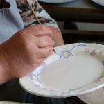 Die stilisierten Blüten werden per Schablonen aufgebracht, die von der Malerin mit der Hand aus Blech ausgeschnitten werden. Bei der Platzierung dient das Relief des Tellers als optische Hilfe. Da das Muster sehr grafisch und überaus regelmäßig wirkt, sollte man als Laie meinen, dass die kleinste Unregelmäßigkeit sofort auffällt. »Nö«, schmunzelt Herrmann trocken, »nicht wirklich.« Was daran liegt, dass das menschliche Auge den Gesamteindruck automatisch zusammenfügt. »Natürlich – wenn man anfängt zu schmieren, dann geht das nicht, man muss schon exakt sein. Aber wenn die Linien mal um ’nen zehntel Millimeter nicht ganz parallell sind, dann geht das in der Gesamtwirkung unter.« Mehr noch: Das gibt dem Ganzen das, was das Handgemalte ausmacht, »s gibt ihm Lebendigkeit, ein bisschen Esprit.«