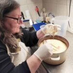 »Natronlauge macht feste Seife, und Kaliumlauge macht Schmierseife«, weiß die Selfmade-Fachfrau. Aus Natronlauge und der flüssigen Fettmischung rührt sie nun eine Art Pudding in der Konsistenz von Mayonnaise. Was von Hand weit über eine halbe Stunde dauern würde, ist dank elektrischem Stabmixer innerhalb weniger Minuten erledigt. Umso wachsamer muss Simone Rieger-Schmider dabei jedoch sein, damit die Konsistenz stimmt. Ist sie zu dick, wird die Seife zu hart, »dann kriegst du sie nicht richtig gut in Form«. Und ist sie zu dünn, »wird die Seife einfach nicht so schön.«