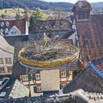 Um den nistenden Störchen ein Ausweichquartier anzubieten wurde vom Betriebshof ein Ersatznest auf dem Dach der Alten Kanzlei gebaut. Unter Einsatz der Feuerwehrleiter wurde Nestmaterial vom vorderen Treppen-Giebel des Rathauses entfernt und sorgsam auf das Ersatznest platziert. Am Dienstag hat erstmals ein Storch das Nest besetzt.